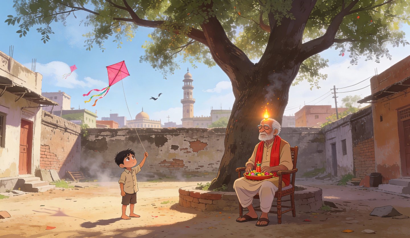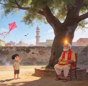 गली रामनाथ में एक ही पेड़ था। वह बरगद का पेड़ पुरानी मसजिद की टूटी दीवार के बीच से निकला हुआ था। अली की पतंग उसकी टहनियों में फंस गई थी। फटी क़मीज़ पहने, छोटा सा अली, नंगे पैरों से गली में लगे पत्थरों को पार करता हुआ, अपने दादा के पास पहुंचा। उसका दादा अपने पिछवाड़े के आंगन में, धूप में बैठा हुआ, ऊंघ रहा था।
