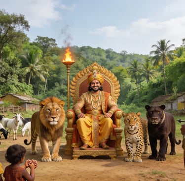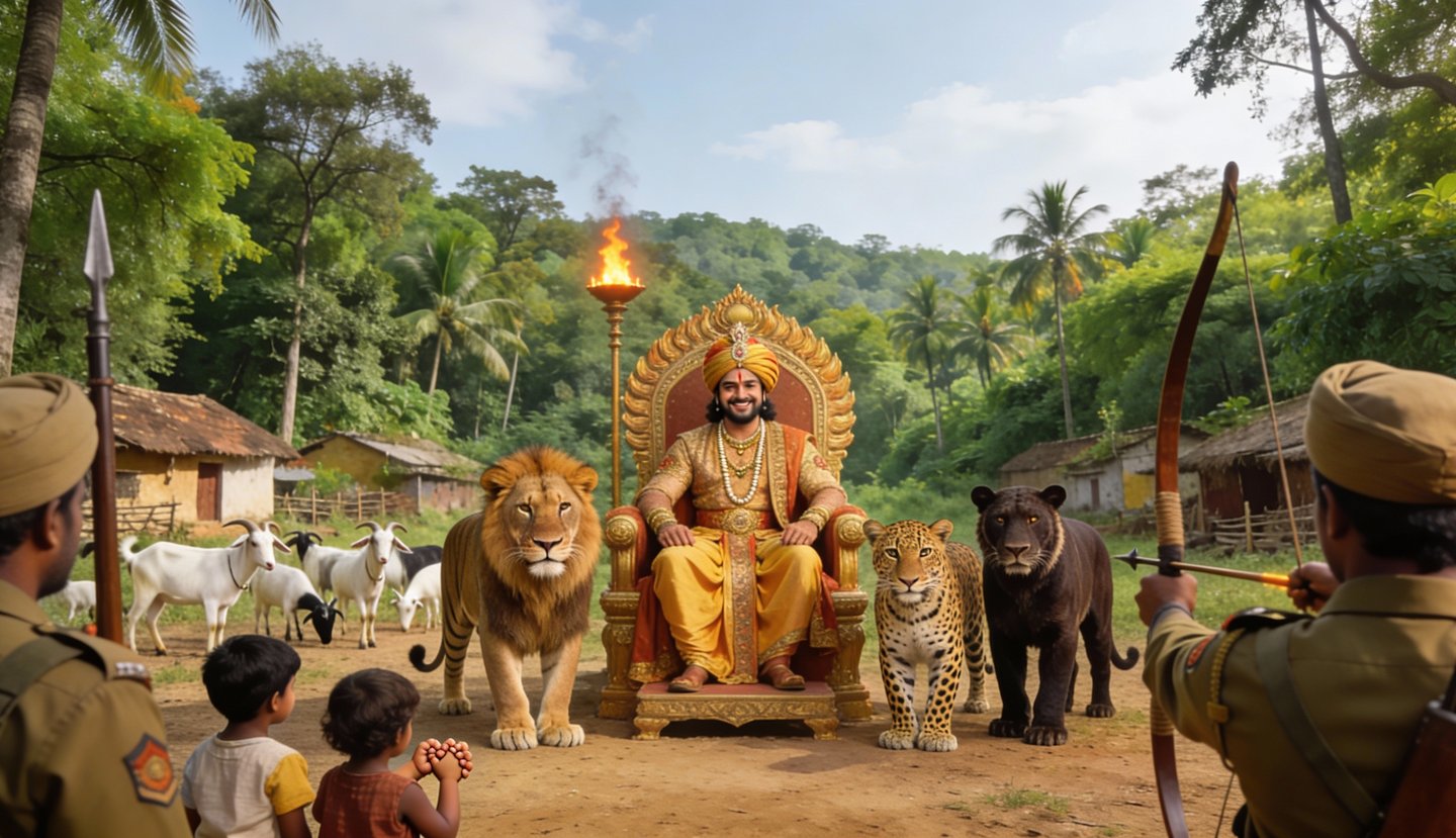 राजा तेज प्रताप सिंह जंगल से शेर-चीता-भालू को गांव लाए—सुंदर मेहमान ! लेकिन रातोंरात गाय-भैंसें गायब ! आखिरकार सैनिकों ने तीरों से भगाया—"मिलजुलकर रहो, नुकसान मत करो!"